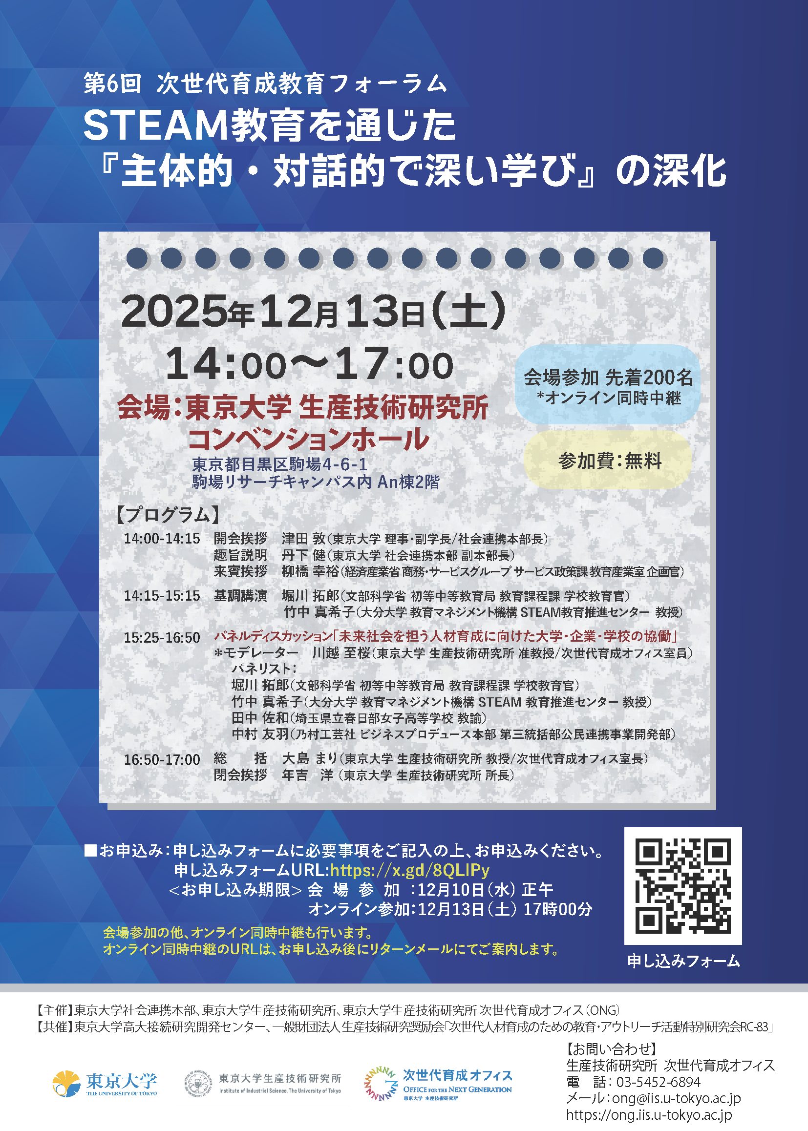 2022年度から本格的に導入された「総合的な探究の時間」を中心に、学校現場では教科等横断的な学びを通したSTEAM教育が広がり、外部との協働も進みつつあります。本フォーラムでは、こうした取り組みを振り返りながら、「主体的・対話的で深い学び」を深化させていくために、大学や企業がどのように関わり、学校現場と連携していくのかを議論します。また、大学の果たす役割や、外部人材の参画、カリキュラム・マネジメントを通じた教育の発展について展望し、社会が求める未来人材像を、学校と社会が協働していかに実現していくかを、多様な事例とともに考えます。