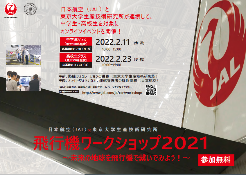 「飛行機ワークショップ2021」参加者募集中! ~未来の地球を飛行機で繋いでみよう~ 日本航空(JAL)と東京大学生産技術研究所が連携して、 中学生・高校生を対象にオンラインイベントを開催! &n...