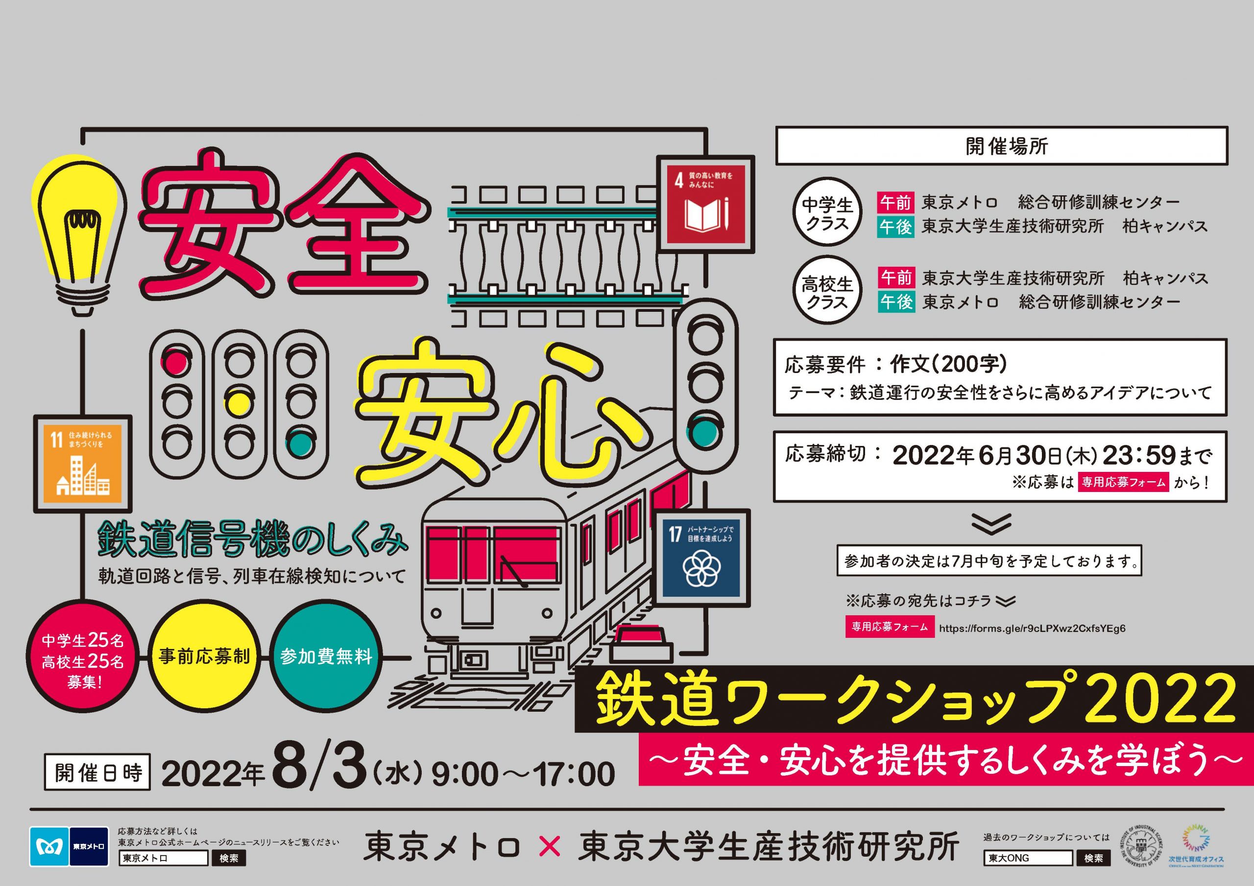 「鉄道ワークショップ2022~安全・安心を提供するしくみを学ぼう~」 1 開催日時 【中学生クラス・高校生クラス】 2022年8月3日(水)9:00~17:00 2 開催場所...